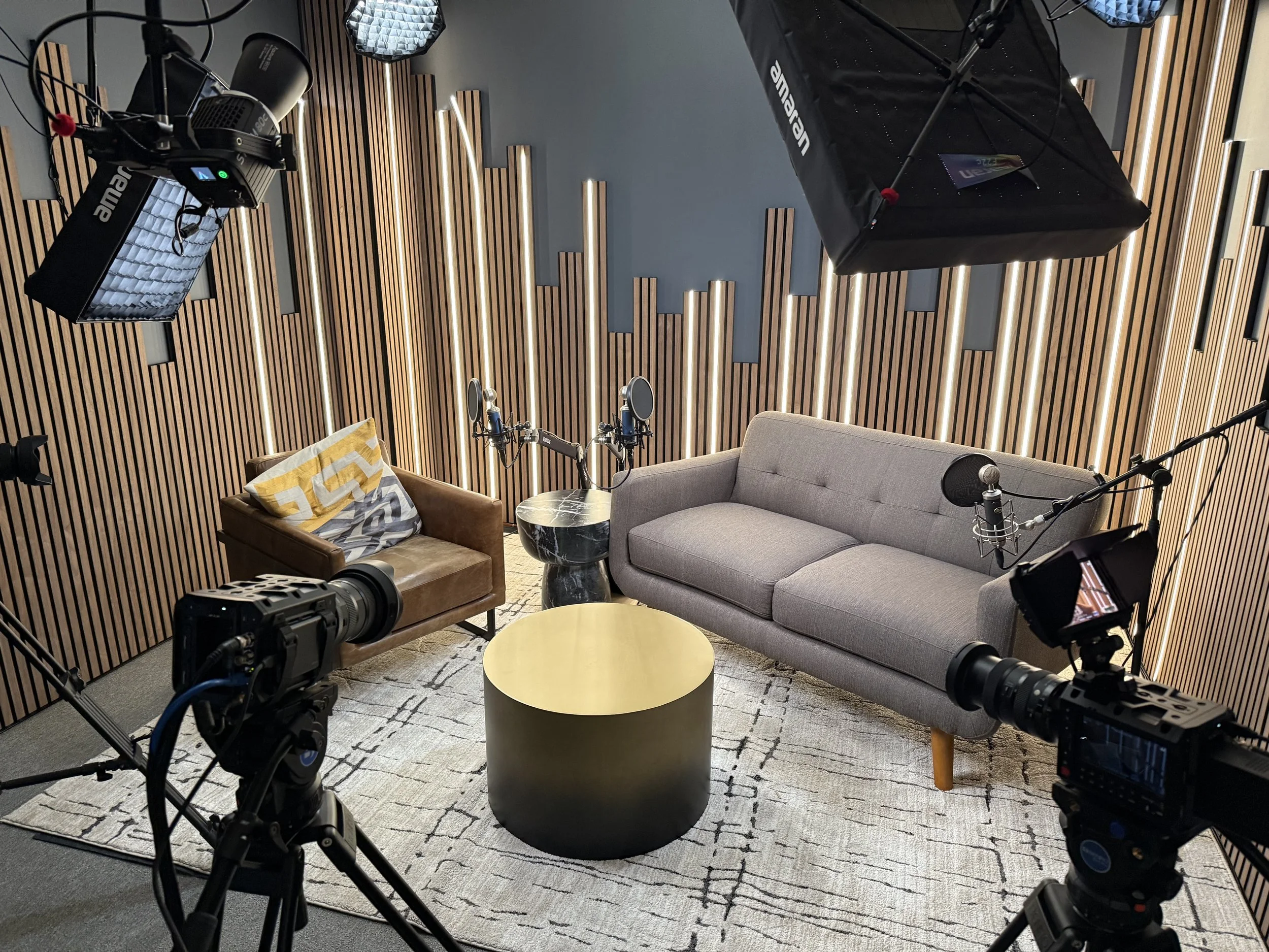 Two professional studio spaces designed for podcasters: a 3-camera interview setup for dynamic conversations and a 1-camera desk setup for solo content. Live switching means you walk out with a finished product.